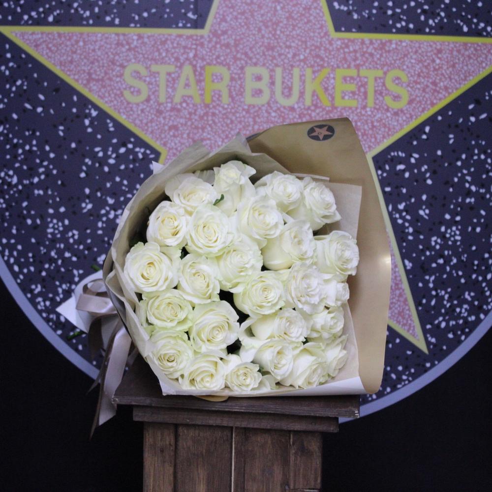 Роза Мондиаль – 25 шт.Тишью – 2 шт.Пленка дизайнерская – 2 шт.Лента атласная – 2 шт.