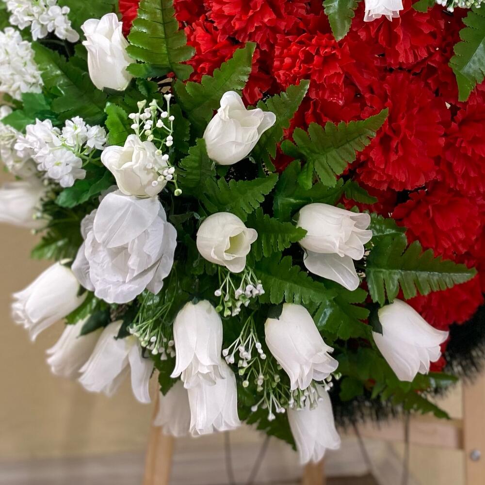 Венок – 1 шт.Роза – 32 шт.Лилия – 3 шт.Гвоздика – 30 шт.зелень декоративная – 15 шт.