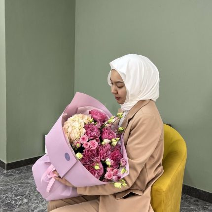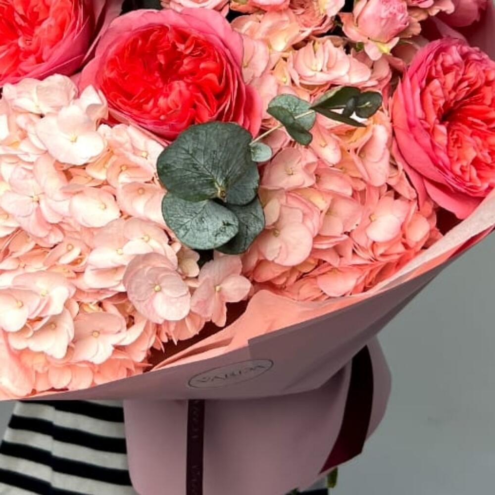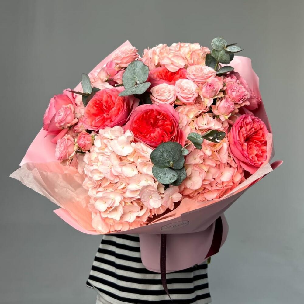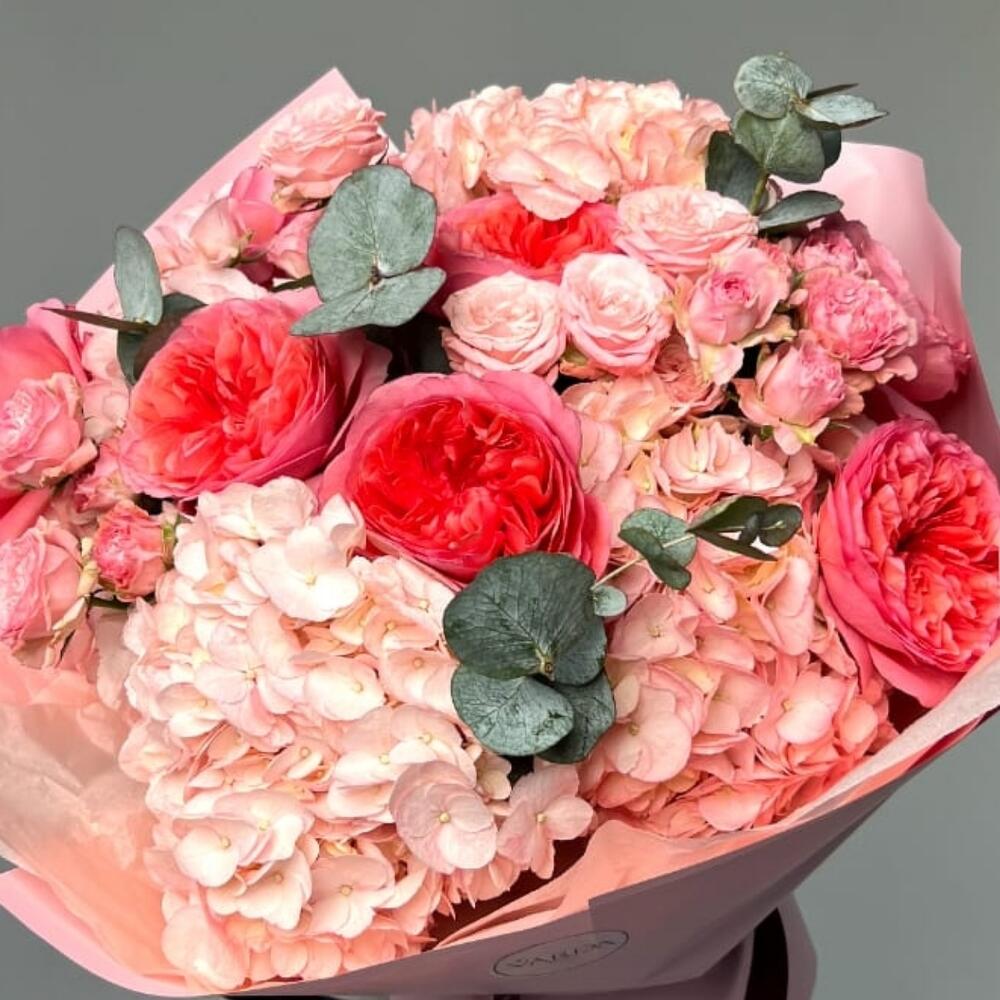 Нежный букет из георгин, пионовидных роз, гвоздик