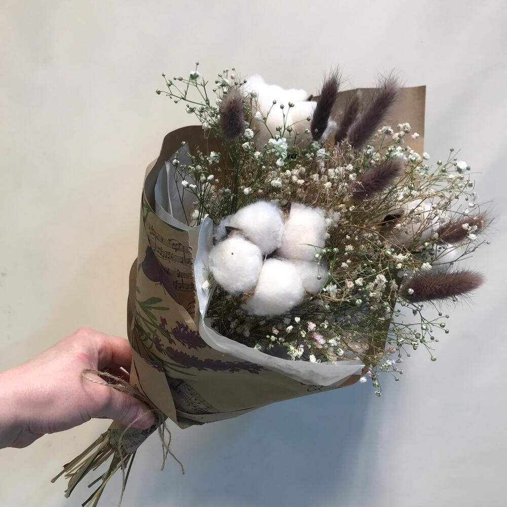 гипсофила сухоцвет – 5 шт.Хлопок натуральный – 3 шт.Лагурус (сухоцвет) – 9 шт.Упаковка дизайнерская – 1 шт.