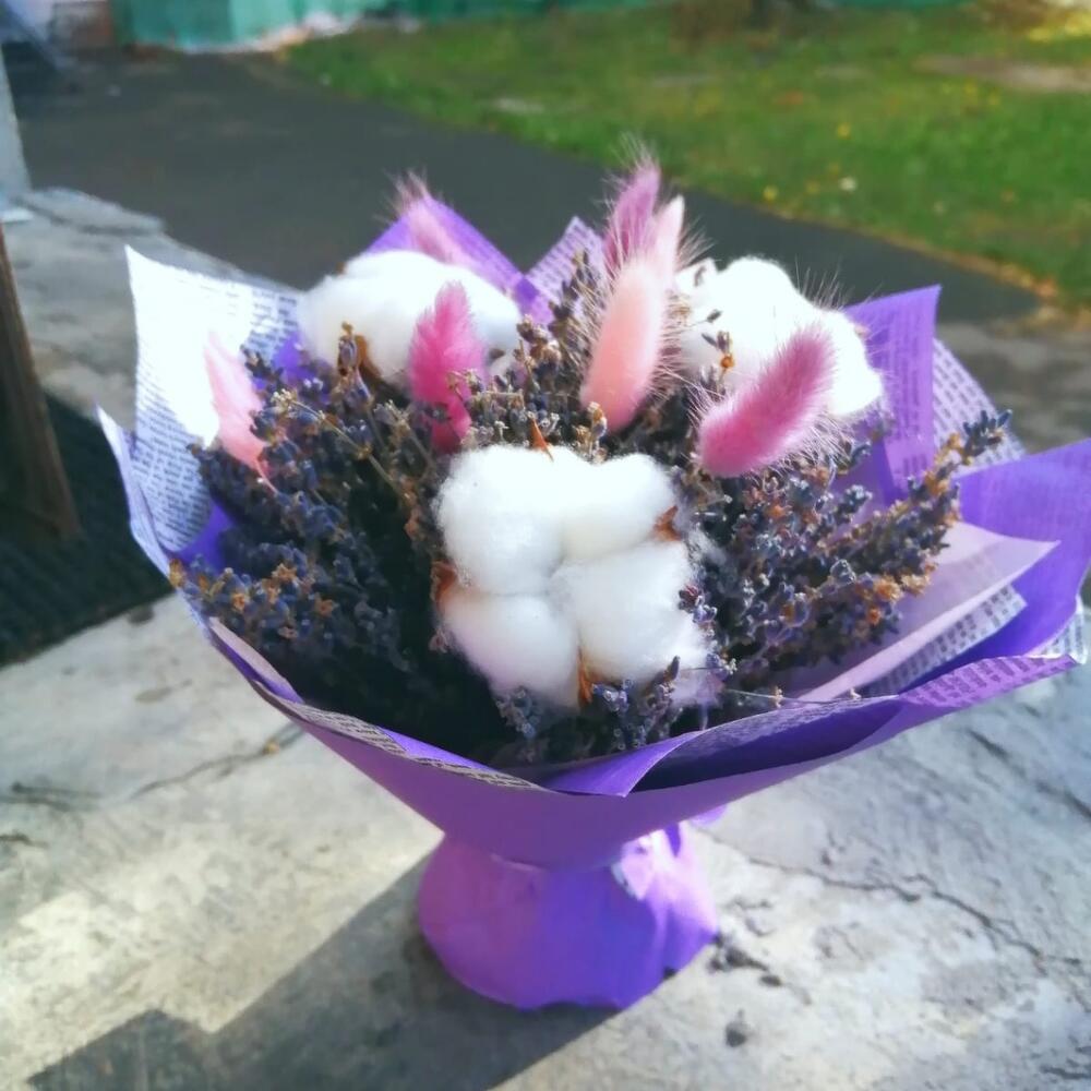 Лаванда (сухоцвет) – 50 шт.Лента – 1 шт.Упаковка – 1 шт.Лагурус – 7 шт.Хлопок натуральный – 3 шт.