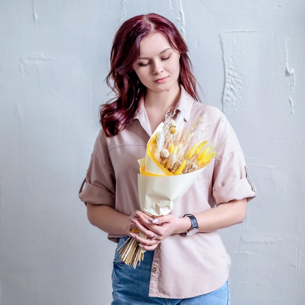 Краспедия – 1 шт.Упаковка дизайнерская – 1 шт.Лагурус – 2 шт.Скабиоза сухая – 2 шт.Тритикале – 1 шт.лимониум стабилизированный – 1 шт.озотамнус стабилизированный – 1 шт.ампелодесмос – 1 шт.кисточки пампасной травы – 2 шт.