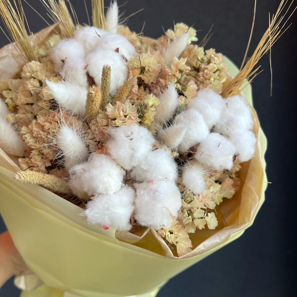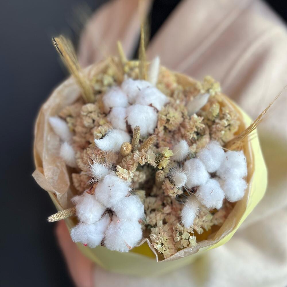 Хлопок – 3 шт.Статица – 5 шт.Лагурус – 9 шт.Пшеница – 3 шт.пучок колосков – 3 шт.декоративная упаковка – 1 шт.Атласная лента – 1 шт.