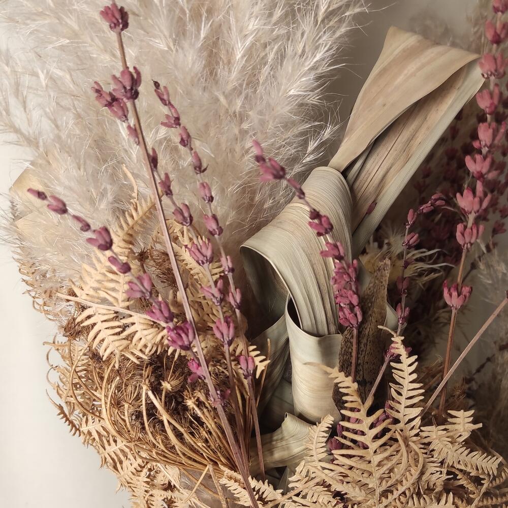 кортадерия – 4 шт.лаванда банч – 1 шт.перья фазан – 7 шт.Амми – 3 шт.карлина – 2 шт.пантус – 2 шт.папоротник стабилизированный – 5 шт.Перчик декоративный – 3 шт.Лента Кружево – 1 шт.