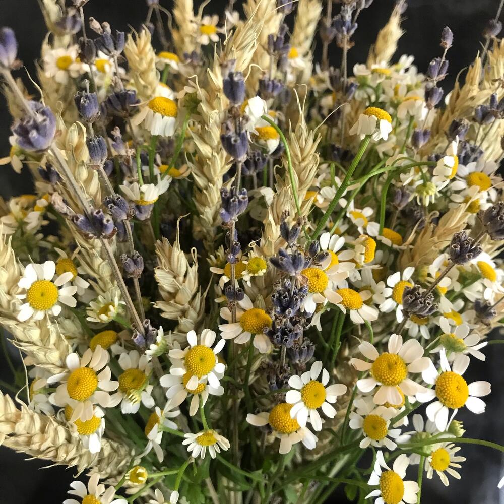 пшеница (сухоцвет) пучок – 1 шт.Лаванда (сухоцвет) пучок – 1 шт.Матрикария (Ромашка Камила) – 5 шт.Упаковка дизайнерская – 1 шт.Лента атласная – 1 шт.