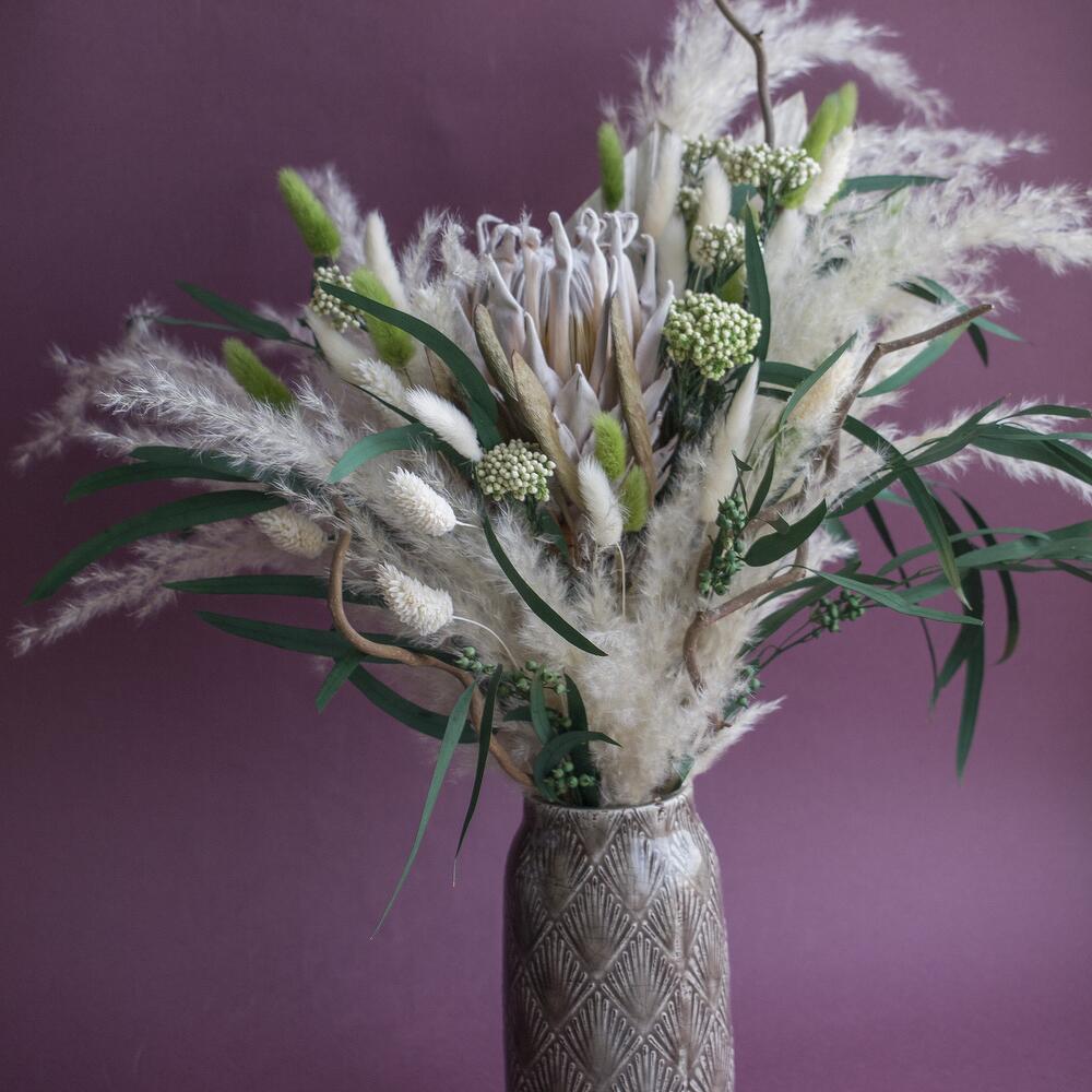 Протея – 1 шт.Ваза – 1 шт.кортадерия – 1 шт.Лагурус – 20 шт.стабилизированный эвкалипт ветка – 10 шт.