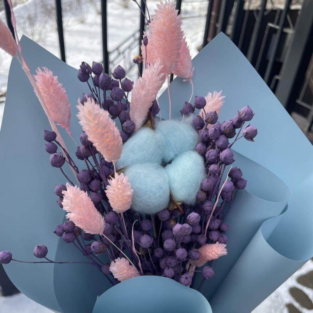 Хлопок натуральный – 1 шт.лëн сухоцвет – 25 шт.Фаларис – 12 шт.Упаковка дизайнерская – 3 шт.Лента атласная – 1 шт.