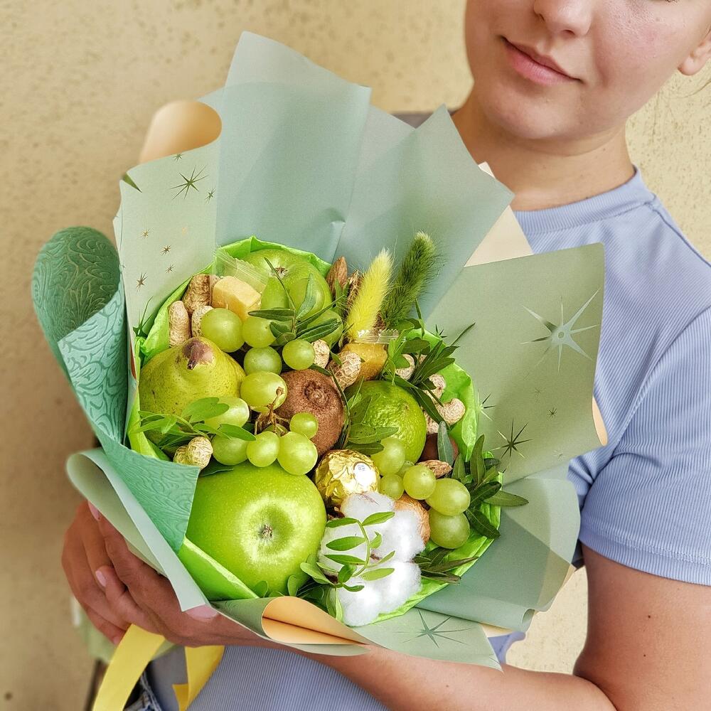 Виноград – 70 гр.Киви – 1 шт.Лайм – 1 шт.Груша – 1 шт.Миндаль – 10 гр.Арахис – 20 гр.коробка транспортировочная – 1 шт.грецкие орехи – 35 гр.яблоки – 2 шт.манговые конфеты – 2 шт.Конфеты Ferrero Rocher – 40 гр.орех макадамия в скорлупе – 1 шт.Хлопок – 1 шт.Лагурус (сухоцвет) – 2 шт.декоративная зелень – 1 шт.