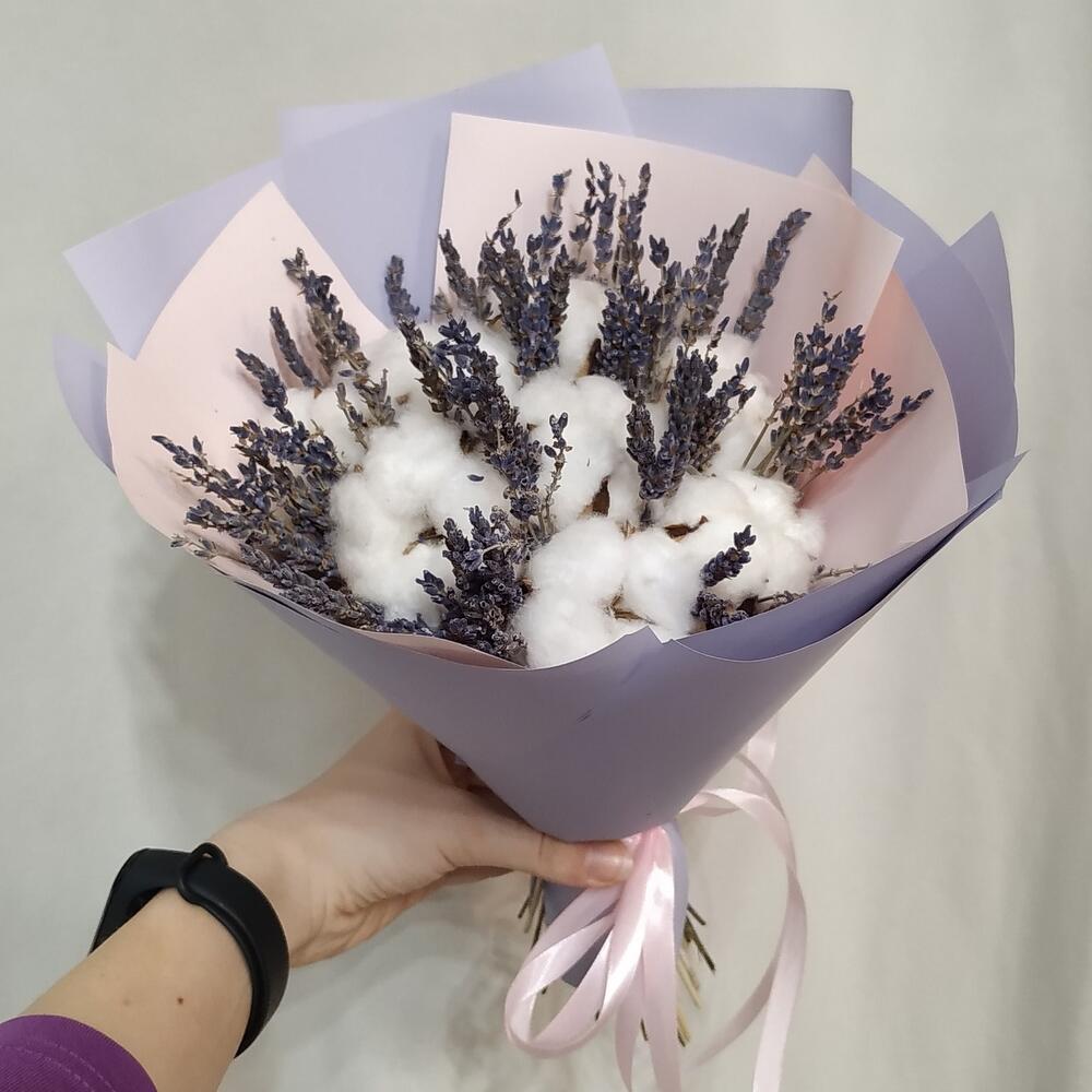 Невесомый букет из натурального хлопка и ароматной лаванды станет нежным украшением на долгое время.