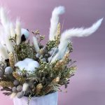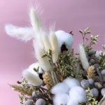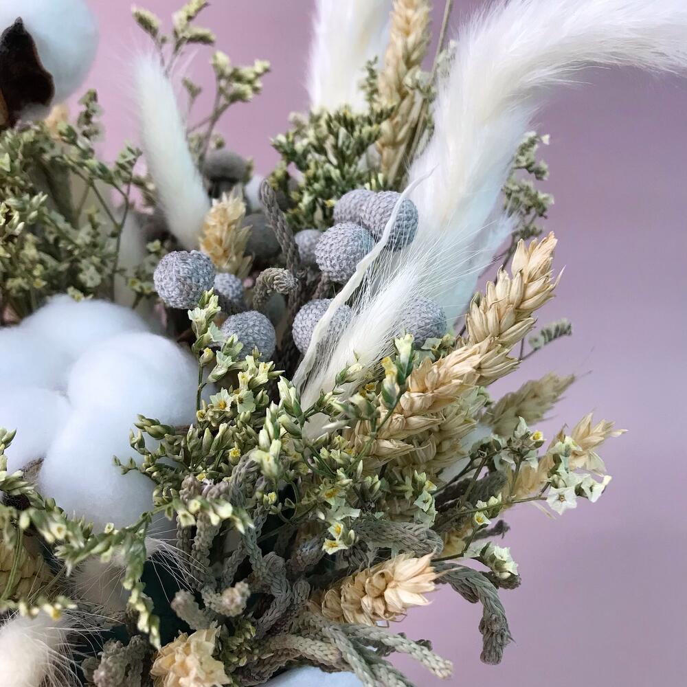 Кашпо керамическое – 1 шт.Ковыль – 3 шт.бруния засушенная – 3 шт.лимониум засушенный – 3 шт.колосья сухоцвет – 11 шт.Хлопок натуральный – 4 шт.лагурус пучок – 5 шт.Оазис флористический – 1 шт.