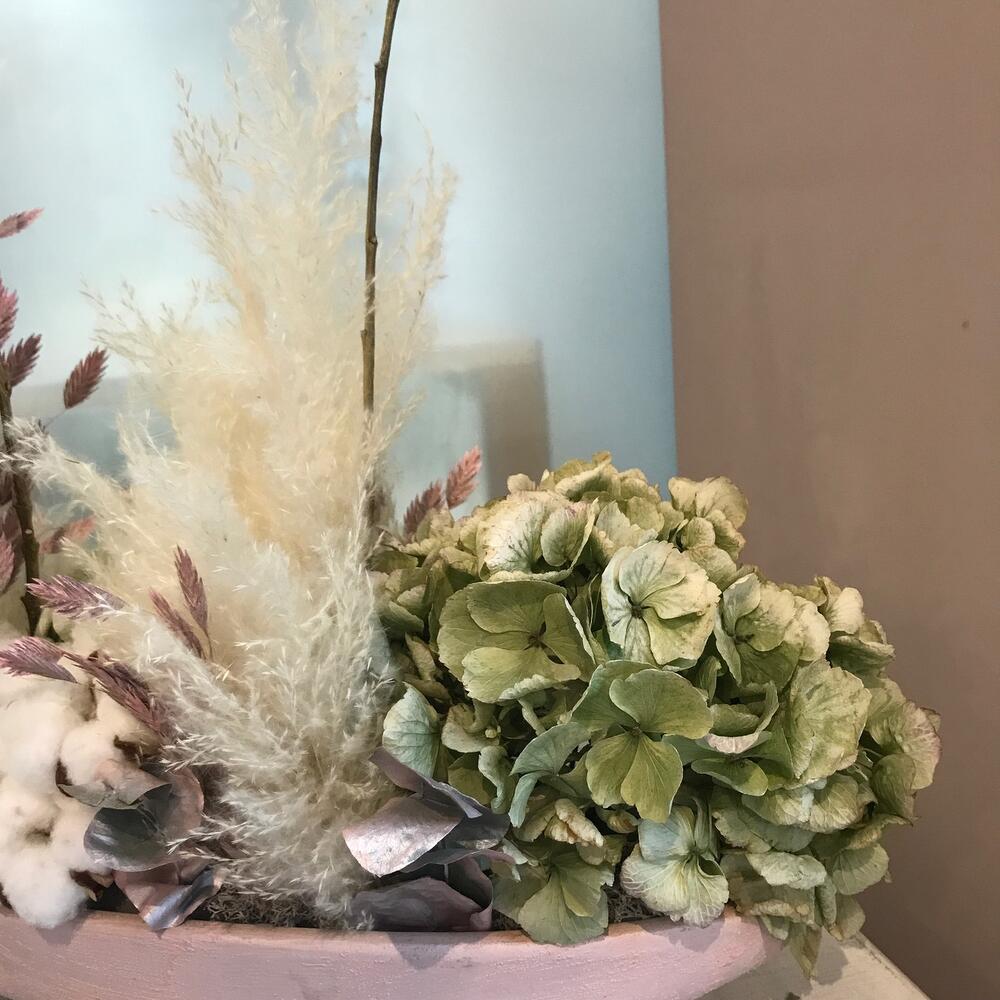 Кашпо керамическое – 1 шт.пена флористическая oasis – 1 шт.Гортензия – 2 шт.Хлопок – 5 шт.Эвкалипт – 1 шт.хасматиум – 4 шт.Мох стабилизированный – 1 шт.пампасная трава (сухоцвет) – 1 шт.