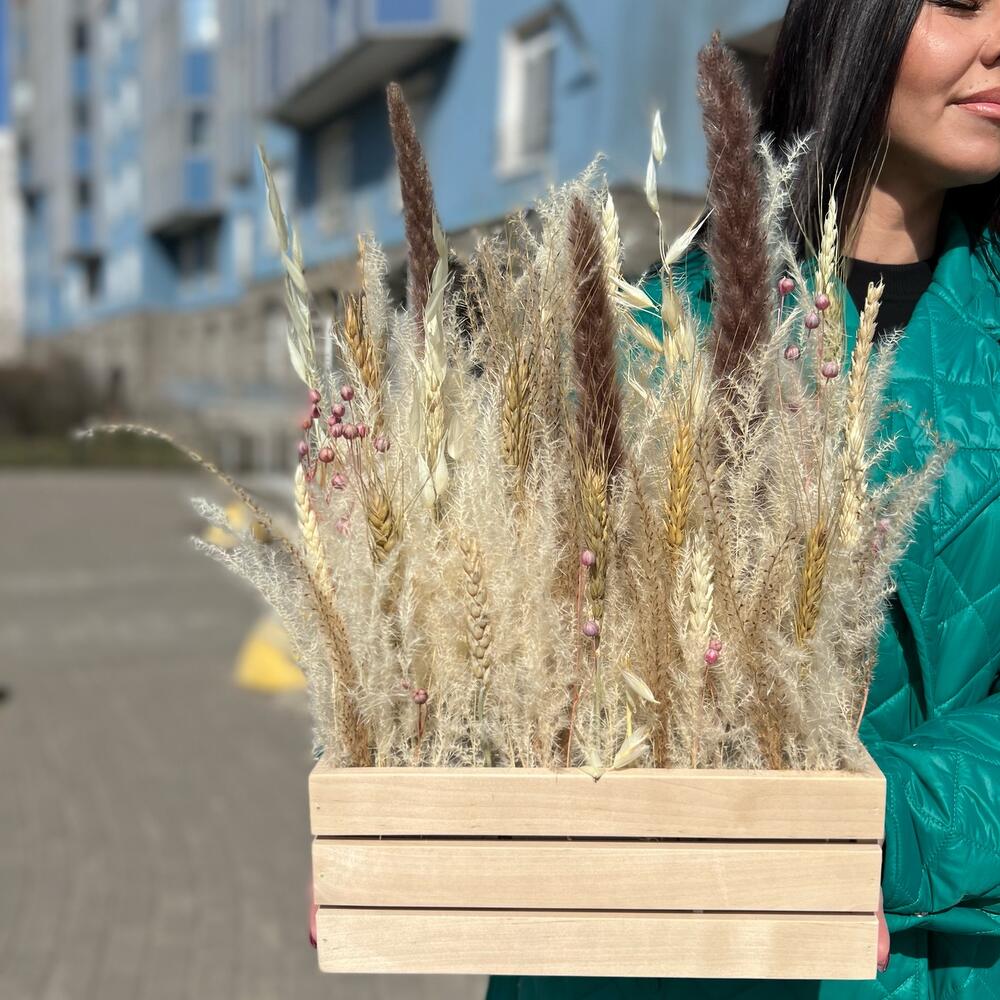 Оазис – 1 шт.Пшеница – 25 шт.Лен – 3 шт.Кашпо деревянное – 1 шт.овес сухоцвет – 3 шт.кортадерия – 3 шт.кортадерия ( бежевая ) – 5 шт.мискантус – 1 шт.