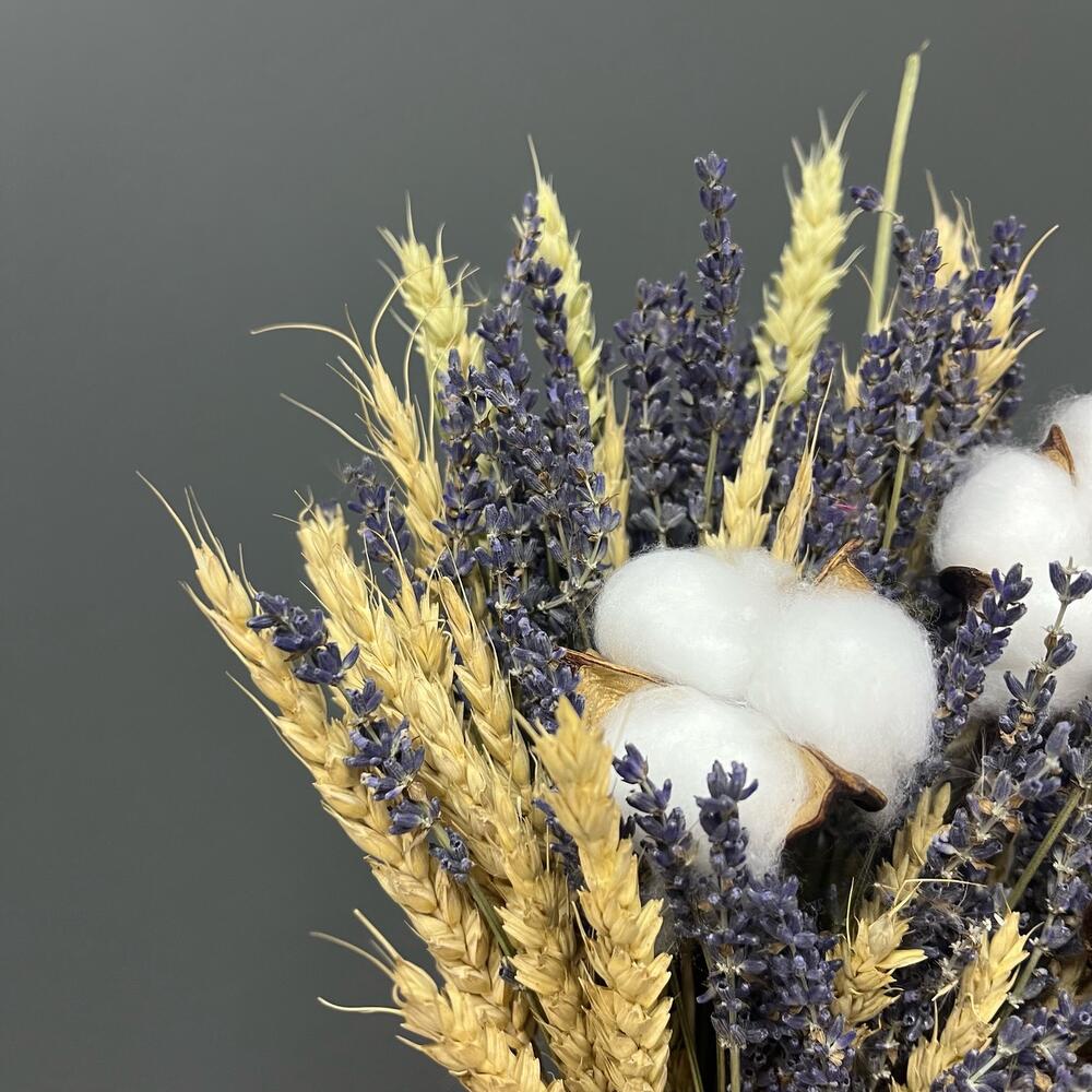 Хлопок натуральный – 3 шт.бечевка натуральная – 1 шт.лаванда сухоцвет банч – 1 шт.пшеница (сухоцвет) банч – 1 шт.
