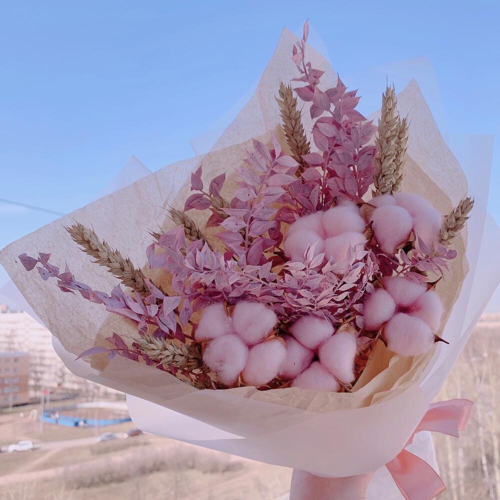 Лента атласная – 1 шт.Колоски – 10 шт.Упаковка дизайнерская – 1 шт.Инструкция по уходу – 1 шт.хлопок розовый – 5 шт.рускус сухоцвет крашенный – 2 шт.