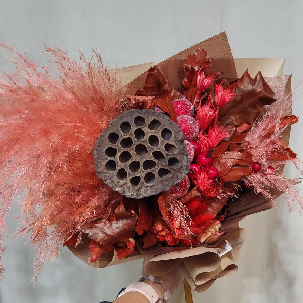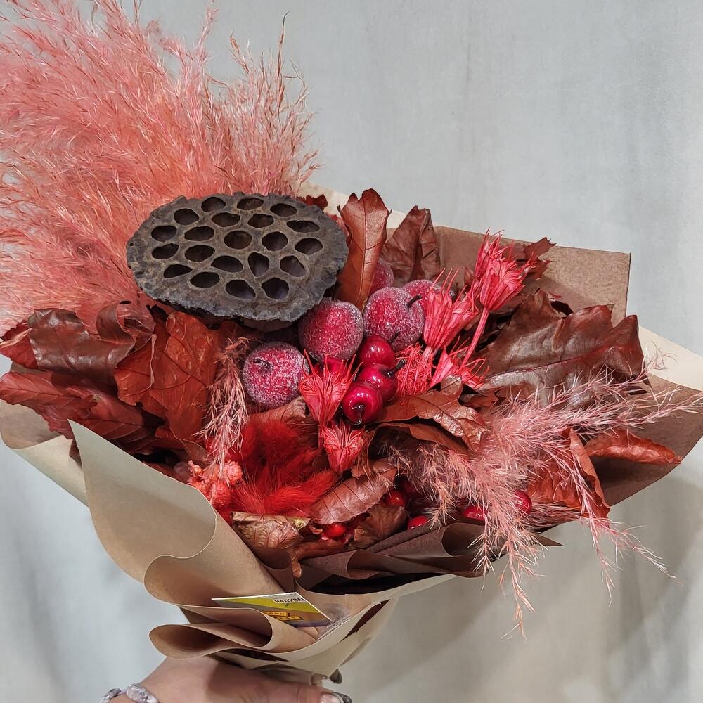 яблоко засахаренное декоративная – 6 шт.Лотос – 1 шт.пампасная трава – 1 шт.Листья Дуба – 2 шт.Лагурус – 11 шт.Буксус – 1 шт.ягоды искусственные – 2 шт.Упаковка крафт – 1 шт.