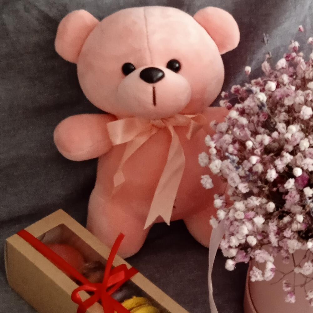 Гипсофила – 15 шт.Лаванда (сухоцвет) – 25 шт.Шляпная коробка – 1 шт.Подарочный пакет – 1 шт.макарон (пирожное) – 6 шт.мишка плюшевый 23 см – 1 шт.