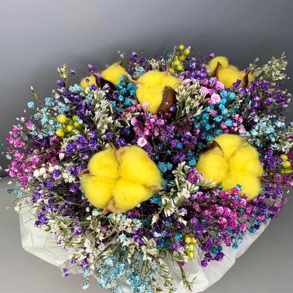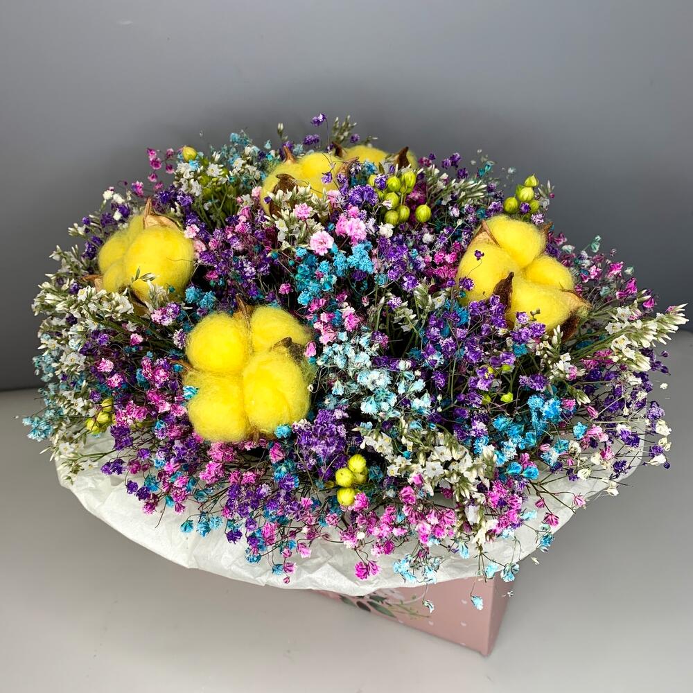 гипсофила сухоцвет – 10 шт.лимониум сухоцвет – 5 шт.Хлопок – 5 шт.абрус сухоцвет – 5 шт.Коробка – 1 шт.Оазис флористический – 1 шт.Тишью – 2 шт.Пленка прозрачная – 1 шт.Лента атласная – 2 шт.