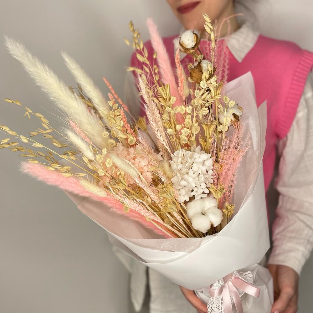 Букет из хлопка, эвкалипта, гипсофилы, колосков