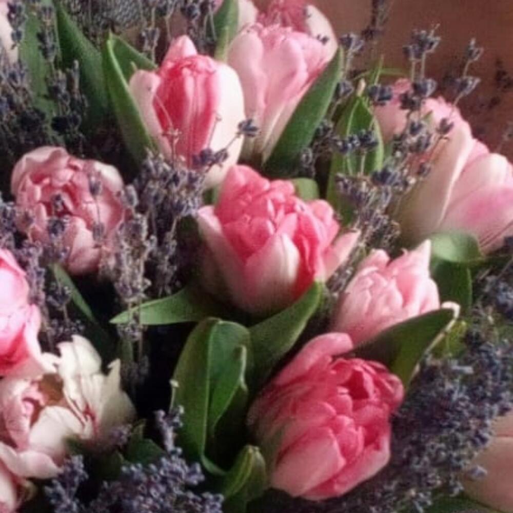 Тюльпан пионовидный – 25 шт.Лаванда (сухоцвет) – 175 шт.Крафт упаковка – 1 шт.Лента атласная – 1 шт.Пакет подарочный – 1 шт.