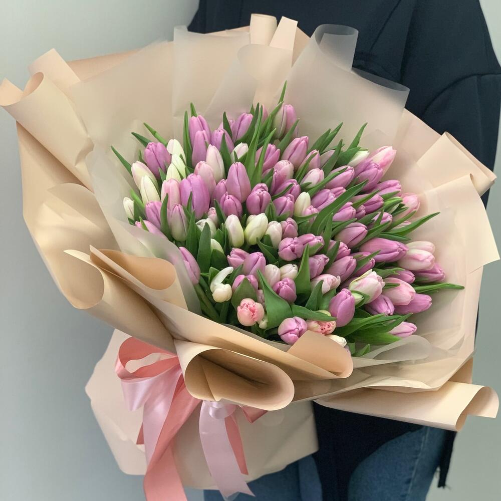 Тюльпан – 101 шт.дезайнерская упаковка – 2 шт.Атласная лента – 1 шт.