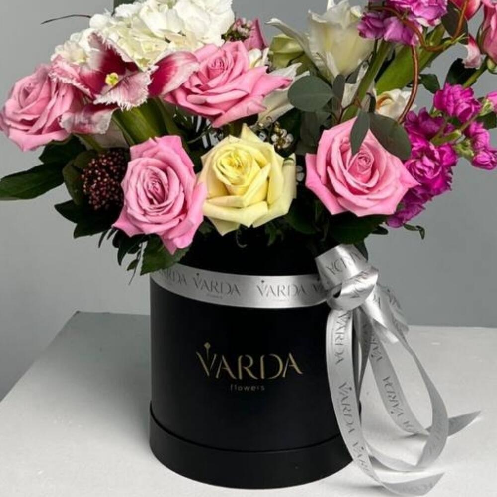 розы – 9 шт. Гортензия – 1 шт. Маттиола – 2 шт. Лилия – 1 шт. Эвкалипт – 1 шт. Скиммия – 1 шт. Салекс – 2 шт. Тюльпан – 1 шт. Ваксфлауэр – 1 шт.