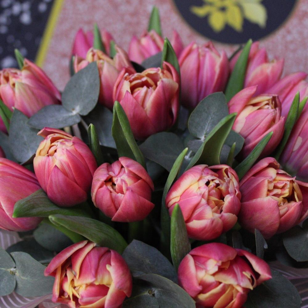 тюльпан пионовидный коламбус – 19 шт.Эвкалипт – 2 шт.Пленка дизайнерская – 1 шт.Шляпная коробка – 1 шт.