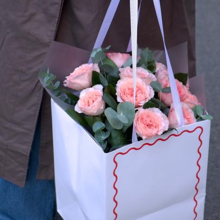 Съедобный фруктовый букет из клубники в шоколаде, черешни и пионовидных роз в дизайнерской коробке “Peach Emotions”